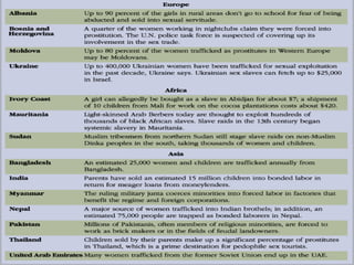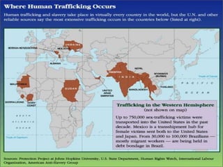 This document discusses human trafficking, which it defines as tricking, luring, or forcing people into situations of forced labor or sexual exploitation where they receive little to no payment. It notes that over 27 million people worldwide are trafficked, making it one of the largest criminal industries. Victims are often promised better opportunities but instead face conditions of modern slavery, experiencing physical and sexual abuse with no freedom or pay. The document urges readers to educate themselves on this issue and get involved in efforts to combat human trafficking.