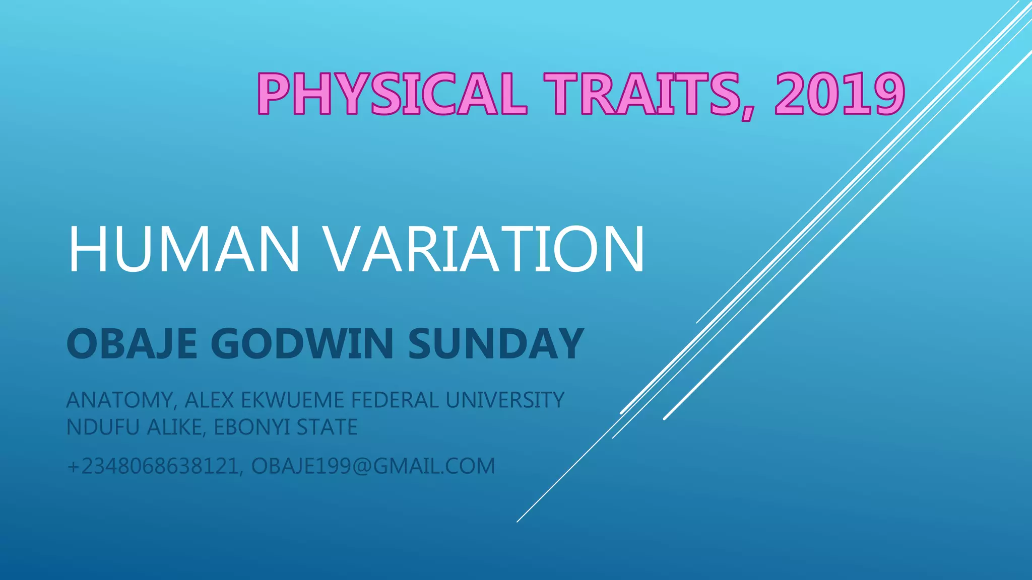 This document discusses various ways in which human populations vary and adapt both physically and culturally to different environmental conditions. It covers topics like acclimation, adaptation, albinism, physical variations between populations, Allen's rule, Bergmann's rule, founder effect, genetic drift, impacts of high altitude and agriculture, lactose tolerance, natural selection, responses to heat and cold, skin color variations, vitamin D production, and diseases like smallpox and syphilis. The document is a compilation of definitions and explanations of these biological and anthropological concepts by Obaje Godwin Sunday from the Anatomy Department of Alex Ekwueme Federal University.