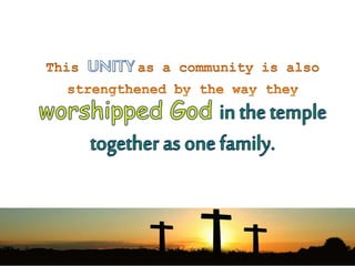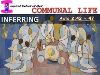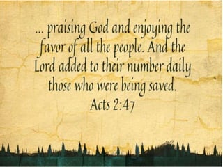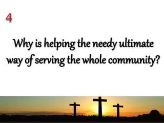 The document discusses living according to God's call and serving others. It identifies distractions that prevent young people from hearing God's call and ways to overcome them, such as recognizing that God calls all people to share in His mission. Early Christians lived in community, sharing meals and praising God together. The document discusses how the Church today continues traits of the early Christian community through programs that develop missionary spirit. Qualities of humility and service are needed to fulfill God's call of building community and proclaiming the Good News. Significant biblical figures and Catholic saints are examples of using talents and gifts to serve God and others.