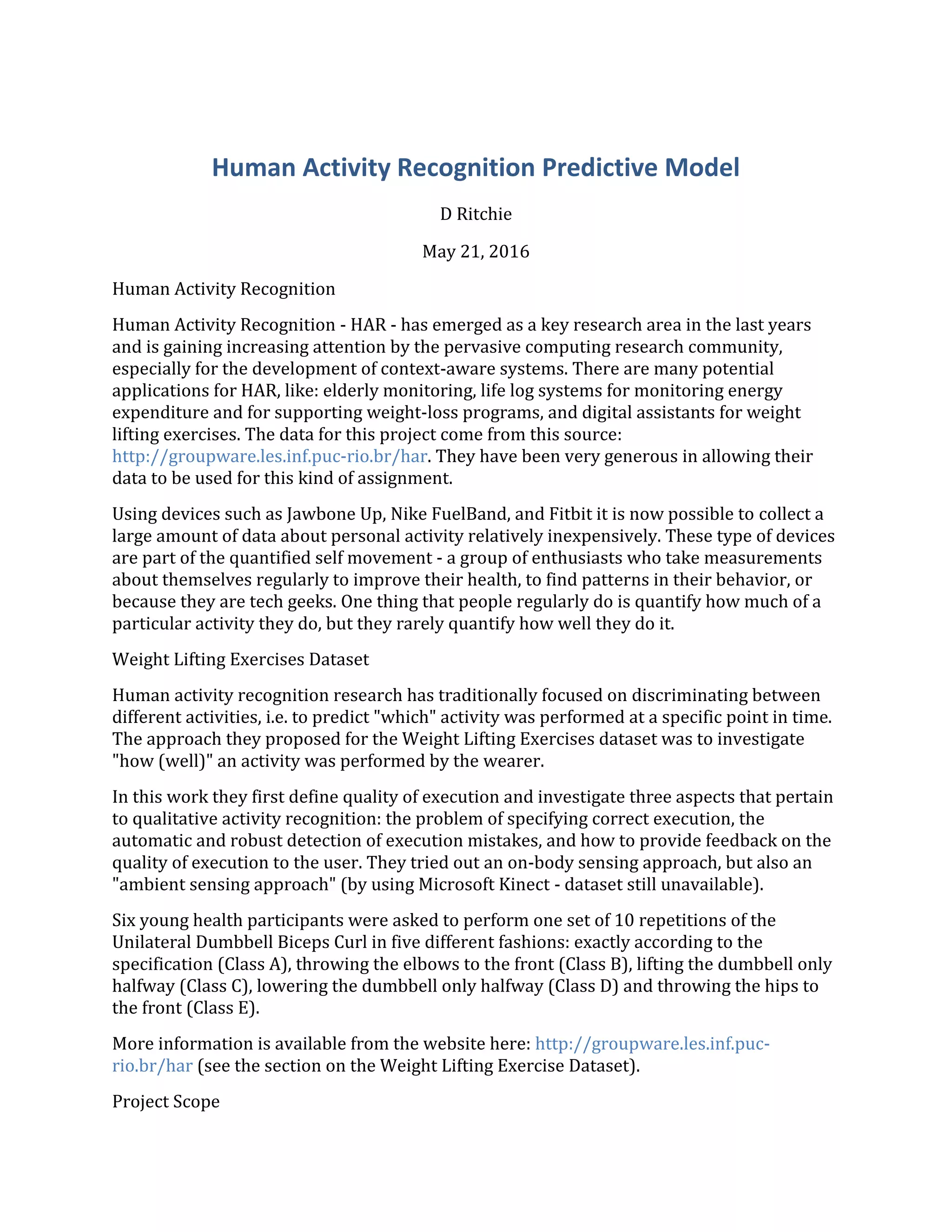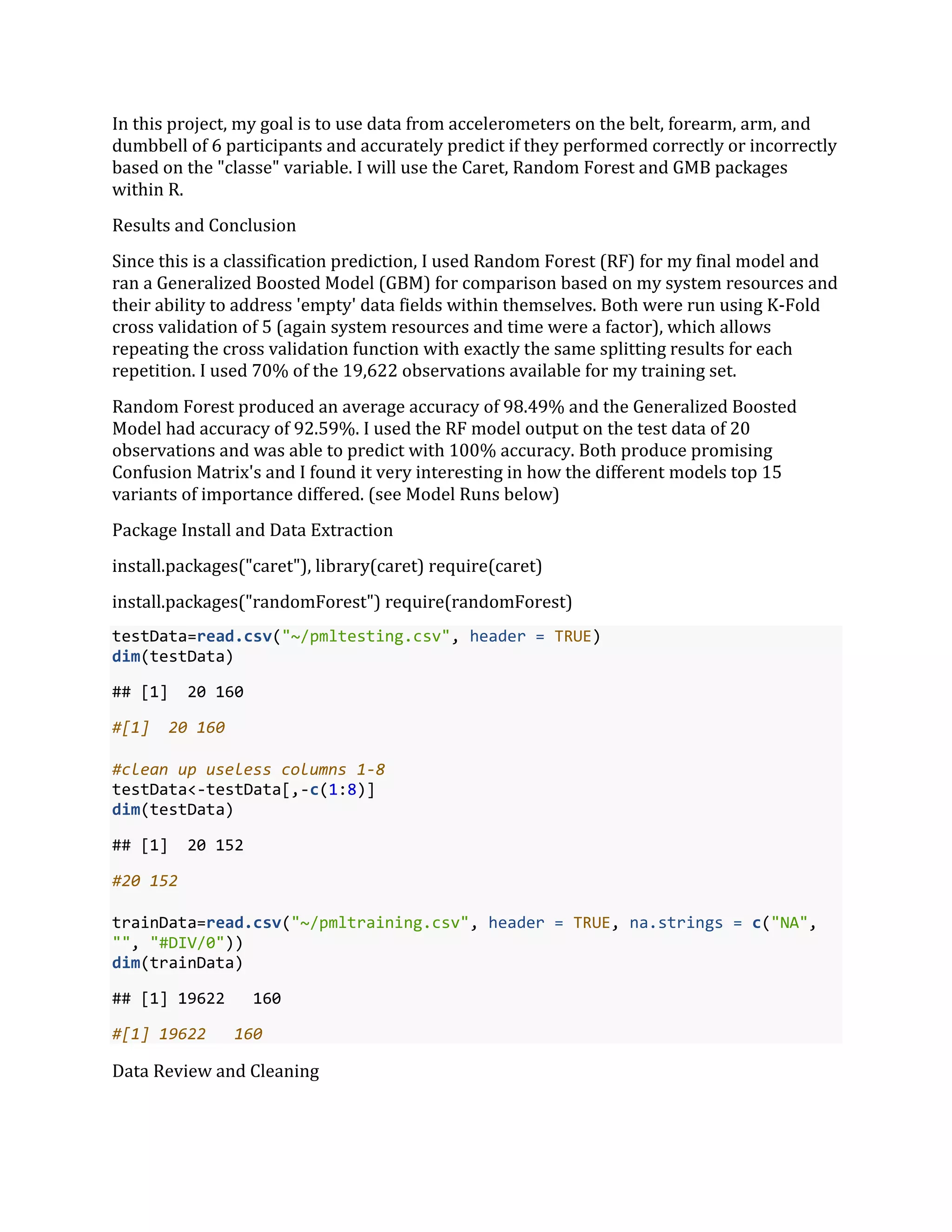 Random Forest and Generalized Boosted Model classification models were used to predict if participants correctly or incorrectly performed a bicep curl exercise based on accelerometer data from wearable devices. Random Forest achieved 98.49% average accuracy on the training data and 100% accuracy on the test data. Generalized Boosted Model achieved 92.59% average accuracy on the training data. Both models produced promising results for classifying the exercise performances.