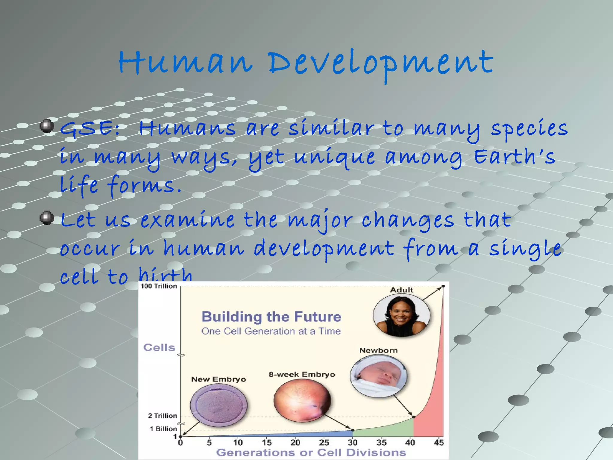 Human development from embryo to newborn occurs in three stages: the first, second, and third trimesters. In the first trimester, the embryo develops organs and body parts from two cell layers and fingerprints form. In the second trimester, the skeleton hardens and skin smoothes out. In the third trimester, organs continue developing and the baby gains weight and length. Comparative embryology shows that while human development is similar to other animals in its cell division and layer formation, it differs in the specific organs developed and whether development occurs inside or outside the mother's body, depending on the species.