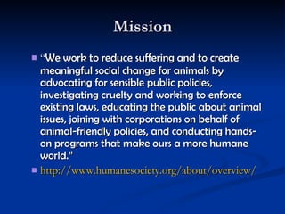 The Humane Society of the United States works to reduce animal suffering and promote animal welfare through advocacy, education, hands-on programs, and enforcement of animal cruelty laws. They operate animal shelters across the country and provide direct care for animals in need. The organization relies on donations and fundraising to support their mission of creating a more humane world for all animals.