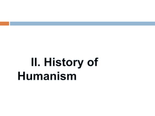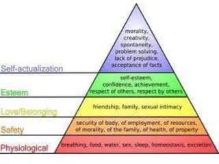This document provides an overview of the humanistic approach in psychology, focusing on the theories of Abraham Maslow and Carl Rogers. Maslow proposed a hierarchy of needs consisting of physiological needs, safety needs, love and belonging needs, esteem needs, and self-actualization. Rogers believed that people have a natural tendency toward self-actualization if they experience genuineness, acceptance, and empathy. The humanistic approach emphasizes an individual's inherent drive toward self-actualization and achieving their full potential. It has implications for education, including fostering students' self-esteem, autonomy, and creativity.