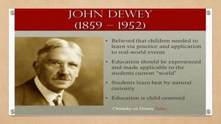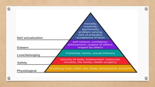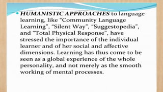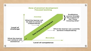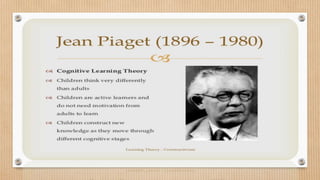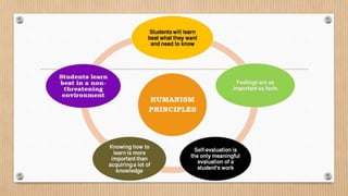 Humanism is a paradigm that focuses on human freedom, dignity, and potential. It emerged in the 1960s. Key figures in humanistic models of learning include Abraham Maslow and Carl Rogers. Maslow proposed a hierarchy of needs and believed in human potential and dignity. Rogers believed that feelings and emotions should be included in education. Constructivism is a theory of learning where students actively construct their own knowledge rather than having it transferred from teachers. Key theorists include Piaget, Vygotsky, and Bruner. Piaget believed that learning is developmental while Vygotsky emphasized social interaction and the zone of proximal development. Constructivism sees the student as an active learner.