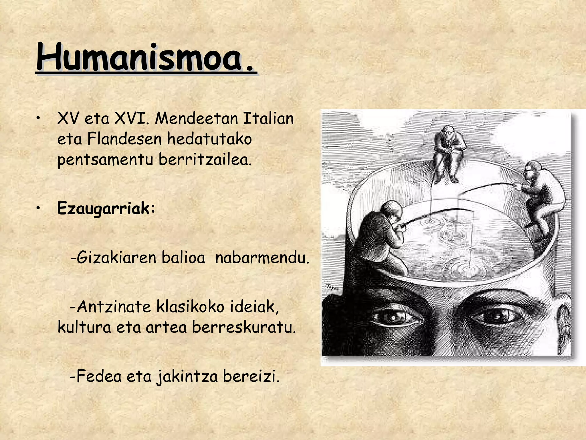 Humanismoa. XV etaXVI. Mendeetan Italian eta Flandesen hedatutako pentsamentu berritzailea. Ezaugarriak: -Gizakiaren balioa nabarmendu. -Antzinate klasikoko ideiak, kultura eta artea berreskuratu. -Fedea eta jakintza bereizi.