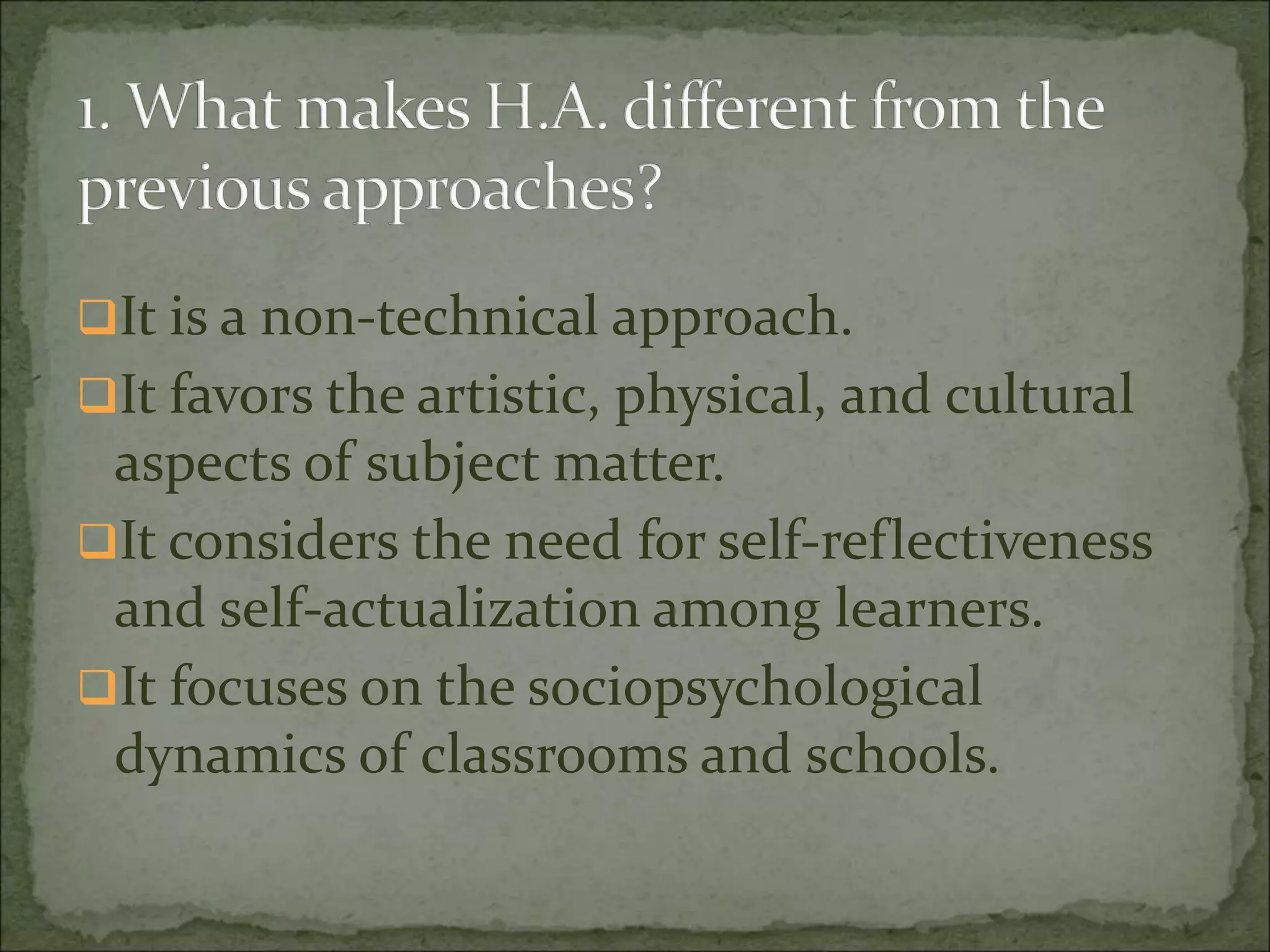 The document discusses the humanistic approach to education. It focuses on educating the whole person by emphasizing artistic, physical, and cultural aspects of learning. It considers the need for self-reflection and self-actualization in learners. Key aspects include cooperative learning, independent learning, small group work, and social activities rather than competitive learning. The teacher acts as a facilitator who encourages reflection and participatory learning.