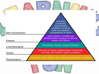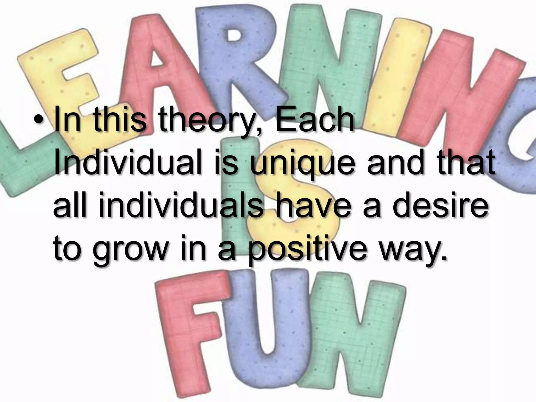The humanistic learning theory focuses on the uniqueness of each individual and their desire to grow positively. It emphasizes spontaneity, feelings, emotions, and individual choice. Motivation comes from personal needs and a desire for growth. Learning is facilitated by curiosity, positive self-concept, and freedom. Key proponents were Abraham Maslow and his hierarchy of needs (physiological, safety, love, esteem, self-actualization), and Carl Rogers's view of unconditional positive self-regard and the teacher as a facilitator. The goal is to foster curiosity, enthusiasm, initiative, and responsibility.