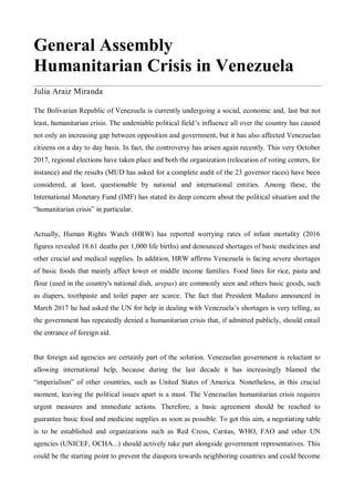 (1) Venezuela is experiencing a severe social, economic, and humanitarian crisis that has been exacerbated by the country's polarized political situation. (2) Shortages of basic necessities like food, medicine, and medical supplies have caused high infant mortality rates and affected lower-income families' ability to access basic goods. (3) While the Venezuelan government has denied the existence of a humanitarian crisis, international aid is needed to provide urgent relief and prevent further problems like migration flows to neighboring countries.