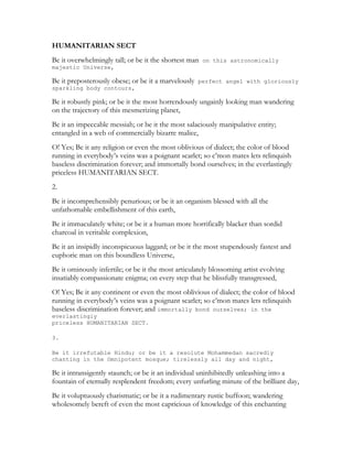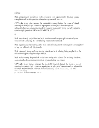 The document advocates forming a humanitarian sect that promotes bonding between all humans regardless of attributes like appearance, beliefs, abilities, or backgrounds. It uses repetitive phrases starting with "Be it..." to describe people of various descriptions, and emphasizes that underneath all differences, all humans share the same blood. It calls on "mates" to relinquish discrimination and immortal bond as part of this humanitarian sect.