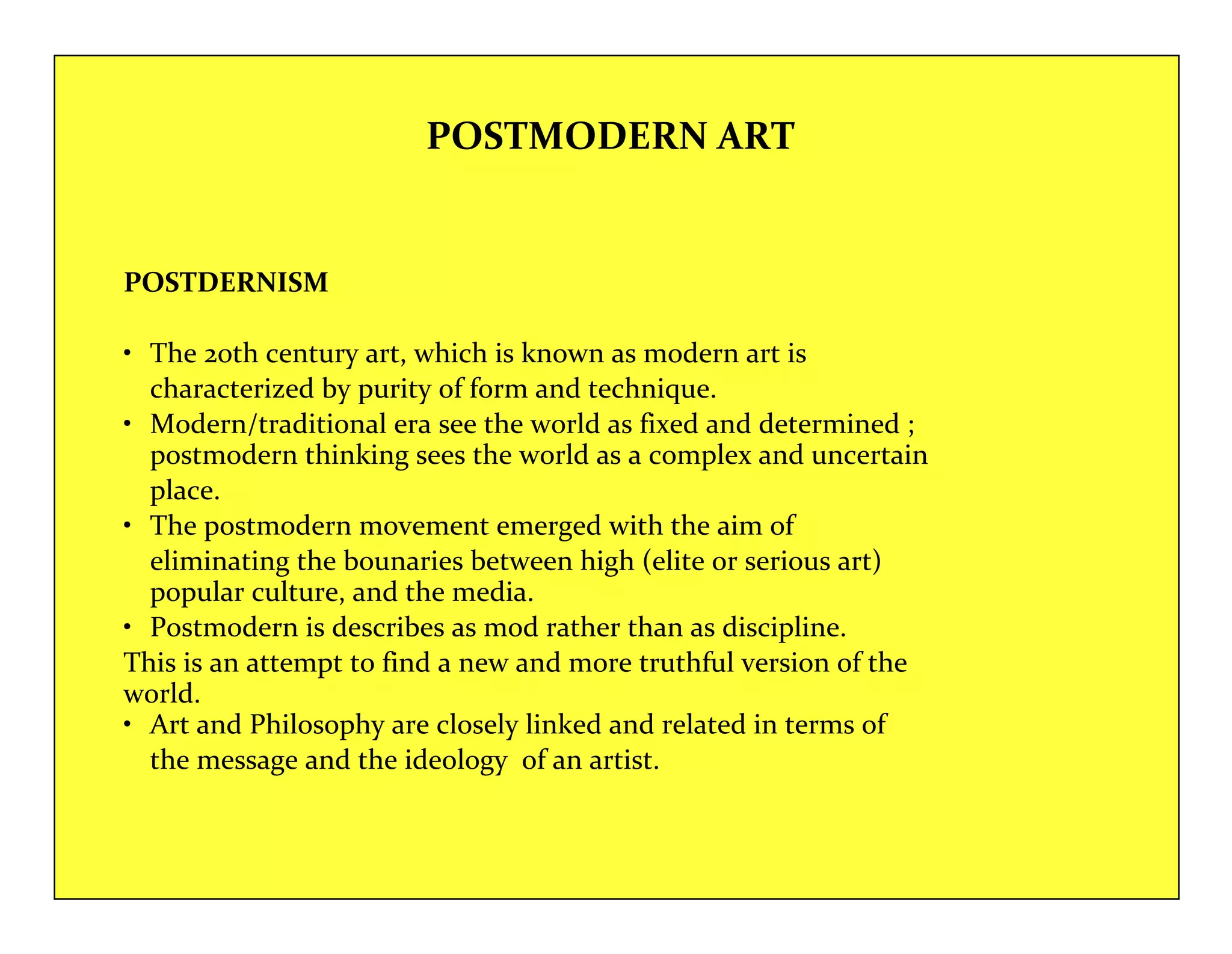 Postmodern art emerged in the 20th century in response to modernism. It rejects the fixed views and purity of form in modern art in favor of a more complex and uncertain view of the world. Postmodernism aims to eliminate boundaries between high and popular culture. Some key movements in postmodern art include minimalism, post-minimalism, new classicism, conceptual art, installation art, and lowbrow art. Postmodern works are characterized by their subjective nature, interest in social issues, and eclectic styles and mediums.