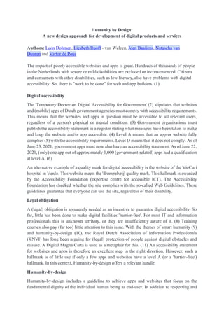 The document discusses the critical need for digital accessibility in websites and apps, particularly for users with disabilities in the Netherlands. It highlights the legal requirements for government agencies to ensure their digital products comply with accessibility standards and the necessity of publishing accessibility statements. The concept of 'humanity-by-design' is presented as an approach to create digital applications that respect individual dignity and fundamental rights while aiming for a broader audience beyond those with recognized disabilities.