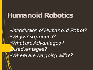 Humanoid robots are robots that resemble humans in appearance and behavior. They have heads, arms, legs and hands like humans. While the concept of humanoid robots dates back to the 1920s, significant development did not occur until the 1970s. Modern humanoid robots have advantages like strength and endurance, but also have disadvantages including being complex, expensive, and not as capable as machines designed for specific tasks. Current research aims to develop humanoids that can perform helpful tasks like assisting the elderly or handling dangerous situations. The future of humanoids is uncertain, but large companies are developing increasingly advanced models to explore applications in services, industries, and more.