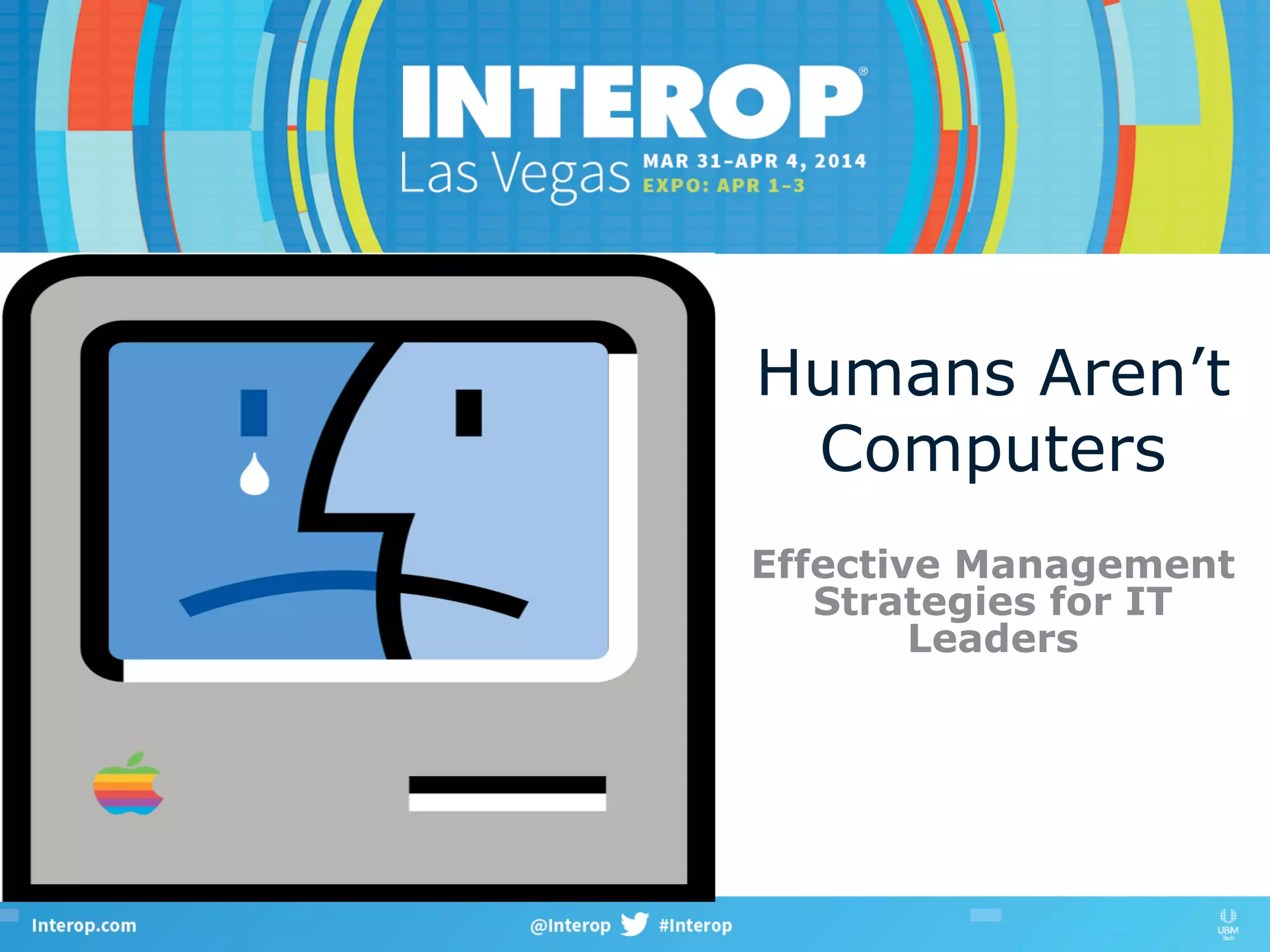 The document discusses effective management strategies for IT leaders, emphasizing the importance of employee engagement and the significant impact of leadership on workplace relationships. It highlights the consequences of disengagement, including financial costs to the U.S. economy, and posits that emotional intelligence, social connections, and respectful confrontation are vital for fostering a positive organizational environment. Key takeaways include the recognition that stress impedes rational thinking, and that confrontation, when approached constructively, can enhance relationships and empower individuals.
