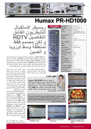 ﺭﻳﺴﻴﻔﺮ ﻻﺳﺘﻘﺒﺎﻝ TECHNIC Manufacturer .Humax Co., Ltd DATA Homepage www.humaxdigital.com ﺍﻟﺘﻠﻴﻔﺰﻳﻮﻥ ﺍﻟﻔﺎﺋﻖ Model 0001PR-HD ﺭﻳﺴﻴﻔﺮ ﺭﻗﻤﻲ ﻻﺳﺘﻘﺒﺎﻝ ﺍﻹﺭﺳﺎﻝ Function Satellite receiver for ﺍﻟﺮﻗﻤﻲ ﺍﻟﻘﻴﺎﺳﻲ DVB-Sﻭ ﺍﻹﺭﺳﺎﻝ ﺍﻟﺮﻗﻤﻲ ﺍﻟﻘﻴﺎﺳﻲ ﺍﻟﺠﺪﻳﺪ 2DVB-S 2DVB-S and DVB-S ﺍﻟﺘﻔﺎﺻﻴﻞ HDTV Channel memory 0005 Satellites 03 Symbol rate 1-45 Ms/sec ﻭ ﻟﻜﻦ ﻣﺼﻤﻢ ﻓﻘﻂ )(from approx. 3 Ms/s in our test SCPC compatible yes USALS yes ﻟﻤﻨﻄﻘﺔ ﻭﺳﻂ ﺃﻭﺭﻭﺑﺎ DiSEqC 3.1 / 2.1 / 0.1 Video formats 1080i, 720p, 576p ﻭ ﺍﻟﺼﻴﻦ Scart connections 2 HDMI output yes Audio/video outputs 3 x RCA YUV output 3x RCA ﻓﻰ ﺍﻟﻌﺪﺩ ﺍﻟﺴﺎﺑﻖ ﻣﻦ ﻣﺠﻠﺔ ﺗﻴﻠﻰ ﺳﺘﻼﻳﺖ ﻗﺪﻣﻨﺎ ﺗﻘﺮﻳﺮ ﻋﻦ ﺃﺟﻬﺰﺓ ﺍﻟﺮﻳﺴﻴﻔﺮ S-Video yes ﺍﻟﺘﻰ ﺗﺴﺘﻘﺒﻞ ﺍﻟﺘﻠﻴﻔﺰﻳﻮﻥ ﺍﻟﻔﺎﺋﻖ ﺍﻟﺘﻔﺎﺻﻴﻞ HDTVﻓﻰ ﺍﻟﻴﺎﺑﺎﻥ ﻭ ﻧﻘﺪﻡ ﺍﻵﻥ UHF modulator no ﺍﻟﺮﻳﺴﻴﻔﺮ Humaxﻻﺳﺘﻘﺒﺎﻝ ﺍﻟﺘﻠﻴﻔﺰﻳﻮﻥ ﺍﻟﻔﺎﺋﻖ ﺍﻟﺘﻔﺎﺻﻴﻞ ﺑﺎﺳﺘﺨﺪﺍﻡ ﺗﻘﻨﻴﺔ 0/12 Volt output no ﺍﻹﺭﺳﺎﻝ ﺍﻟﺮﻗﻤﻰ ﺍﻟﺠﺪﻳﺪﺓ 2 DVB Sﻭ ﺍﻟﺬﻯ ﻳﻌﺘﺒﺮ ﺃﻭﻝ ﺟﻬﺎﺯ ﺭﻳﺴﻴﻔﺮ ﻣﺘﻘﺪﻡ ﻳﻌﻤﻞ Digital audio output yes ﺑﻬﺬﺍ ﺍﻟﻨﻈﺎﻡ ﻭﺻﻞ ﺇﻟﻴﻨﺎ ﻹﺟ ﺮﺍء ﺍﻻﺧﺘﺒﺎﺭ ﻋﻠﻴﺔ ﻭ ﻋﻠﻴﻨﺎ ﺃﻥ ﻧﺬﻛﺮ ﻓﻰ ﺍﻟﺒﺪﺍﻳﺔ ﺃﻥ ﻫﺬﺍ EPG no ﺍﻟﺮﻳﺴﻴﻔﺮ ﻣﻌﺪ ﻟﻼﺳﺘﺨﺪﺍﻡ ﻓﻰ ﻣﻨﻄﻘﺔ ﻭﺳﻂ ﺃﻭﺭﻭﺑﺎ ﻭ ﺍﻟﺼﻴﻦ ﻓﻘﻂ ﺣﺘﻰ ﺍﻟﻴﻮﻡ . C/Ku band compatible yes SatcoDX compatible no ﺑﺎﻟﻠﻮﻥ ﺍﻷﺳﻮﺩ ﺍﻟﺬﻯ ﻳﺤﻤﻰ ﺷﺎﺷﺔ ﻳﺴﺘﺤﻖ ﺍﻟﺮﻳﺴﻴﻔﺮ ﺟﺎﺋﺰﺓ ﻟﺤﺴﻦ Power supply 90-250 VAC, 50/60 Hz ﺍﻟﻌﺮﺽ ﻭ ﻋﺪﺩ ﺧﻤﺲ ﺃﺯﺭﺍﺭ ﻟﻠﺘﺤﻜﻢ ﺗﺼﻤﻴﻤﻪ ﺍﻷﻧﻴﻖ ، ﺍﻟﻜﺎﺑﻴﻨﺔ ﺍﻟﺨﺎﺭﺟﻴﺔ Power consumption max. 45W, standby 20W ﺍﻟﻜﺎﻣﻞ ﺑﺎﻟﺮﻳﺴﻴﻔﺮ ﺑﺪﻭﻥ ﺍﺳﺘﺨﺪﺍﻡ ﻭﺣﺪﺓ ﻓﻀﻴﺔ ﺍﻟﻠﻮﻥ ﻭ ﻳﻮﺟﺪ ﻏﻄﺎء ﺍﻟﺤﻤﺎﻳﺔ ﺗﺤﻜﻢ ﻋﻦ ﺑﻌﺪ ﺑﺎﻹﺿﺎﻓﺔ ﺇﻟﻰ ﻋﺪﺩ 2 ﻓﺘﺤﺔ ﻹﺩﺧﺎﻝ ﺍﻟﻜﺎﻣﺎﺕ ﺑﻤﺨﺘﻠﻒ ﺃﻧﻮﺍﻉ ﺗﻌﻠﻴﻖ ﺍﻟﺨﺒﺮﺍء ﺍﻟﺘﺸﻔﻴﺮ ﻭ ﻗﺎﺭﺉ ﻛﺮﻭﺕ ﺟﺎﻫﺰ ﻟﻠﻌﻤﻞ + ﺑﻌﺪ ﺇﺩﺧﺎﻝ ﺍﻟﻜﺎﺭﺕ ﺍﻟﺬﻛﻲ ﻟﺘﺘﻤﻜﻦ ﻣﻦ ﺇﻥ ﺗﺸﻐﻴﻞ ﺍﻟﺮﻳﺴﻴﻔﺮ 0001Humax PR-HD ﻣﺸﺎﻫﺪﺓ ﺍﻟﺒﺎﻗﺎﺕ ﺍﻟﻤﺪﻓﻮﻋﺔ ﺍﻷﺟﺮ ، ﻭ ﻳﺘﻢ ﺑﻄﺮﻳﻘﺔ ﺳﻬﻠﺔ ﻭ ﻣﻤﺘﻌﻪ ﻭ ﻳﺴﻬﻞ ﺍﻟﺘﻨﻘﻞ ﺑﻴﻦ ﺍﻟﻘﻮﺍﺋﻢ ﻟﻜﻦ ﻳﺠﺪﺭ ﺍﻟﺬﻛﺮ ﺍﻧﻪ ﻻ ﺑﺪ ﻣﻦ ﺇﺩﺧﺎﻝ ﺍﻟﺘﻰ ﺗﻢ ﺗﺼﻤﻴﻤﻬﺎ ﺑﻄﺮﻳﻘﺔ ﻭﺍﺿﺤﺔ ﻭ ﻳﺴﺘﺤﻖ ﺩﻟﻴﻞ ﺍﻟﻜﺎﺭﺕ ﺍﻟﺬﻛﻲ ﺑﻄﺮﻳﻘﺔ ﻣﻘﻠﻮﺑﺔ ﺃﻱ ﺁﻥ ﺍﻟﺒﺮﺍﻣﺞ ﺍﻹﻟﻜﺘﺮﻭﻧﻲ ﺟﺎﺋﺰﺓ ﻛﺒﻴﺮﺓ ، ﺇﻥ ﺍﻟﺼﻮﺭﺓ ﺍﻟﻌﺎﻟﻴﺔ ﻣﻨﻄﻘﺔ ﺍﻟﺘﻼﻣﺲ ﻓﻰ ﺍﻟﻜﺎﺭﺕ ﺗﻜﻮﻥ ﺇﻟﻲ ﺍﻟﻮﺿﻮﺡ ﻛﺎﻟﻜﺮﻳﺴﺘﺎﻝ ﺑﺎﺳﺘﺨﺪﺍﻡ ﻣﻨﻔﺬ HDMIﺗﺄﺧﺬ Thomas Haring TELE-satellite EPG ﺃﻋﻠﻰ ﻭ ﻟﻴﺲ ﺇﻟﻲ ﺍﺳﻔﻞ . ﺍﻷﺑﺼﺎﺭ ﻭ ﻳﺼﻌﺐ ﻣﻌﻬﺎ ﺍﻟﻌﻮﺩﺓ ﺇﻟﻰ ﻣﺸﺎﻫﺪﺓ ﺍﻟﻘﻨﻮﺍﺕ Test Center Austria ﻭ ﻓﻰ ﺍﻟﻠﻮﺣﺔ ﺍﻟﺨﻠﻔﻴﺔ ﻟﻠﺮﻳﺴﻴﻔﺮ ﺍﻟﺘﻰ ﺍﻟﺮﻗﻤﻴﺔ ﺍﻟﻌﺎﺩﻳﺔ . ﺗﻢ ﺗﺠﻬﻴﺰﻫﺎ ﺑﻄﺮﻳﻘﺔ ﺟﻴﺪﺓ ﺗﺠﺪ ﻣﺨﺮﺝ ﺻﻮﺭﺓ HDMIﻭ ﻋﺪﺩ 3 ﺟﺎﻛﺎﺕ - ﻣﻦ ﻧﻮﻉ RCAﺗﻌﻤﻞ ﻛﻤﺨﺎﺭﺝ ﻟﻨﻈﺎﻡ ﺗﻮﺟﺪ ﺑﻄﺊ ﻓﻰ ﺍﻟﺒﺮﻧﺎﻣﺞ ﺍﻟﺘﺸﻐﻴﻠﻰ ﻓﻰ ﺑﻌﺾ ﺍﻟﻨﻮﺍﺣﻲ ﻣﺜﻞ ) ﺳﺮﻋﺔ ﺍﻟﺼﻮﺭﺓ YUVﺑﺎﻹﺿﺎﻓﺔ ﺇﻟﻲ ﻋﺪﺩ 3 ﺍﻟﺒﺤﺚ ، ﻣﺪﺓ ﺗﺤﻤﻴﻞ ﺑﻴﺎﻧﺎﺕ ﺩﻟﻴﻞ ﺍﻟﺒﺮﺍﻣﺞ ﺍﻹﻟﻜﺘﺮﻭﻧﻲ ﻭ ﺯﻣﻦ ﺍﻟﺘﻨﻘﻞ ﺑﻴﻦ ﺍﻟﻘﻨﻮﺍﺕ ( ﻭ ﻟﻜﻦ ﻫﺬﺍ ﻳﻤﻜﻦ ﺗﺼﺤﻴﺤﻪ ﻥ ﺧﻼﻝ ﺍﻟﺸﺮﻛﺔ ﺍﻟﻤﻨﺘﺠﺔ ﻣﻦ ﺧﻼﻝ ﺟﺎﻛﺎﺕ RCAﺃﺧﺮﻯ ﺗﻌﻤﻞ ﻛﻤﺨﺎﺭﺝ ﺍﻟﺒﺮﺍﻣﺞ ﺍﻟﺘﺸﻐﻴﻠﻴﺔ ﺍﻟﺠﺪﻳﺪﺓ . ﻟﻠﺼﻮﺭﺓ ﻭﺍﻟﺼﻮﺕ ﺍﻻﺳﺘﺮﻳﻮ ﺍﻟﺘﻤﺎﺛﻠﻲ ﻭ SCPC reception ﻋﺪﺩ 2 ﻣﻮﺻﻞ ﺳﻜﺎﺭﺕ ﻭ ﻣﺨﺮﺝ ﺻﻮﺕ ﺭﻗﻤﻰ ﻭ ﻣﻨﻔﺬ USBﻭ ﻣﻨﻔﺬ 232RS ﻭ ﺃﺧﻴ ﺮﺍ ﻭ ﻟﻴﺲ ﺃﺧ ﺮﺍ ﻣﺪﺧﻞ ﺇﺷﺎﺭﺍﺕ IFﻭ ﻣﺨﺮﺝ ﺗﻤﺮﻳﺮ ﻟﻬﺎ ، ﺑﺎﻹﺿﺎﻓﺔ ﺇﻟﻲ ﻣﻔﺘﺎﺡ ﻃﺎﻗﺔ ﺭﺋﻴﺴﻲ ﻟﻐﻠﻖ ﺍﻟﺘﻴﺎﺭ ﺍﻟﻜﻬﺮﺑﻲ ﺗﻤﺎﻣﺎ ﻟﺘﻮﻓﻴﺮ ﺍﺳﺘﻬﻼﻙ 02 ﻭﺍﺕ ﻋﻨﺪ ﻭﺿﻊ ﺍﻟﺮﻳﺴﻴﻔﺮ ﻓﻰ ﺣﺎﻟﺔ ﺍﻻﻧﺘﻈﺎﺭ . Reception of CCTV in SITV-HD not recognised in SITV-HD not recognised in ﻭ ﺗﻌﻄﻰ ﻭﺣﺪﺓ ﺍﻟﺘﺤﻜﻢ ﻋﻦ ﺑﻌﺪ ShenZhen, China DVB mode DVB-S2 and 8PSK modes ﺍﻧﻄﺒﺎﻋﺎ ﺟﻴﺪﺍ ﻋﻨﺪ ﻭﺿﻌﻬﺎ ﻓﻰ ﺍﻟﻴﺪ ﺣﻴﺚ either www.TELE-satellite.com — TELE-s