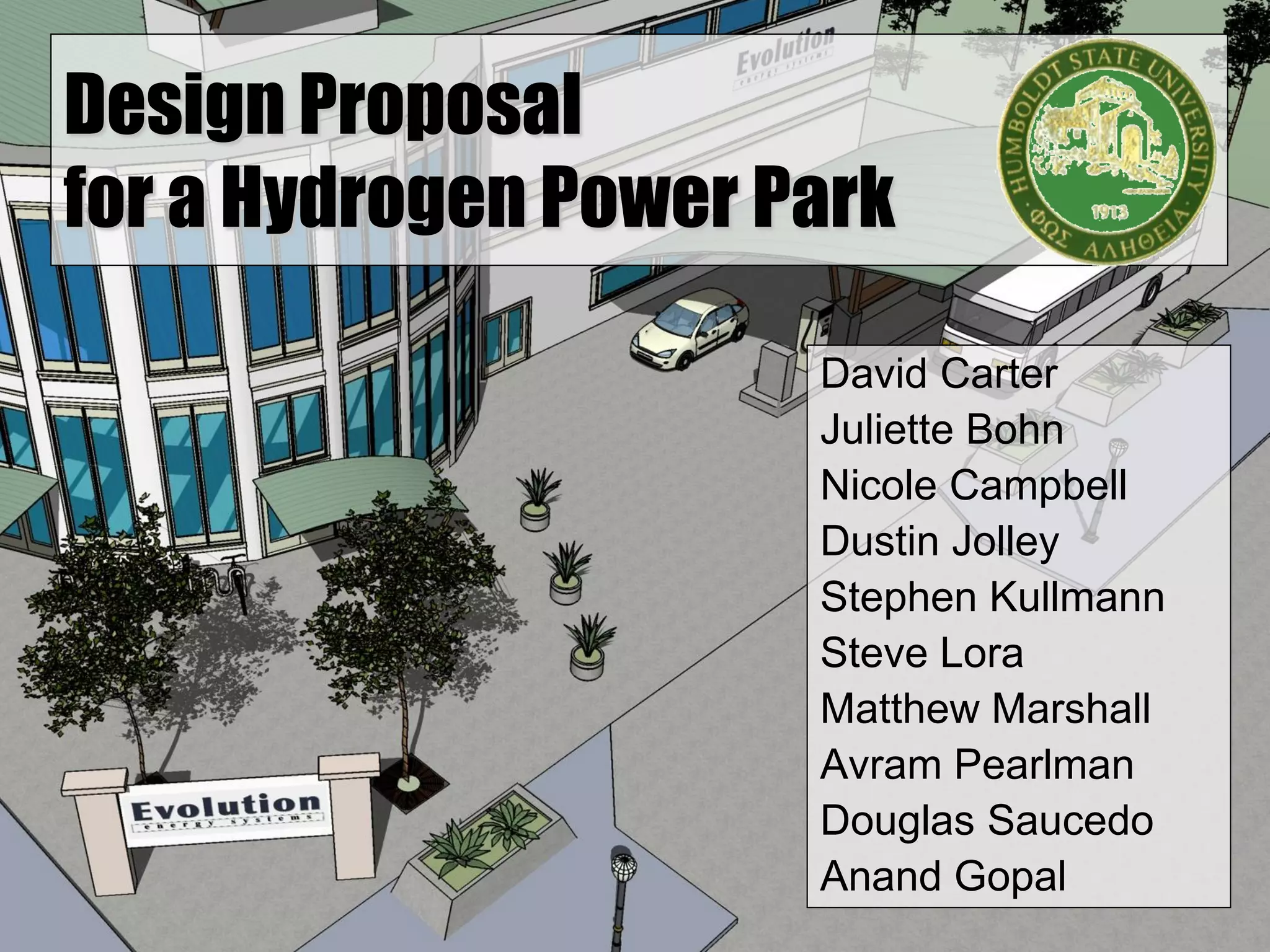 The Humboldt State University Student Design Team proposes a hydrogen power park to provide renewable energy. The power park would produce hydrogen fuel, electricity, and heat. It would use landfill gas from a local landfill as a renewable fuel source. The team's design criteria includes producing at least 100 kW of electricity and meeting increasing hydrogen fueling demands of 50 kg per day in 2010 and 250 kg per day in 2019. The team developed a simulation model to optimize the power park's design for reliability, serviceability, and economics. The simulation results showed the power park could reliably meet fueling demands and produce excess hydrogen for sale. An economic analysis found the power park could sell hydrogen for $39-47 per kg while offering $2