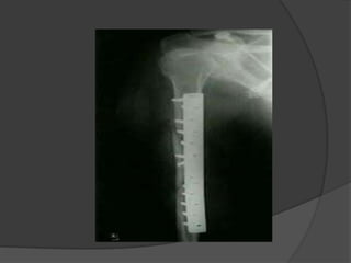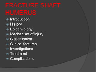 This document provides an overview of humerus shaft fractures, including: