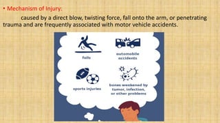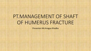 The document outlines the management of humeral shaft fractures, detailing mechanisms of injury, treatment methods, and rehabilitation protocols. Various treatment options include coaptation splints, Velpeau dressings, intramedullary nails, plate fixation, and external fixation, each with specific indications based on fracture type. It emphasizes rehabilitation objectives, expected healing durations, and the importance of assessing associated injuries and functional recovery throughout the healing process.