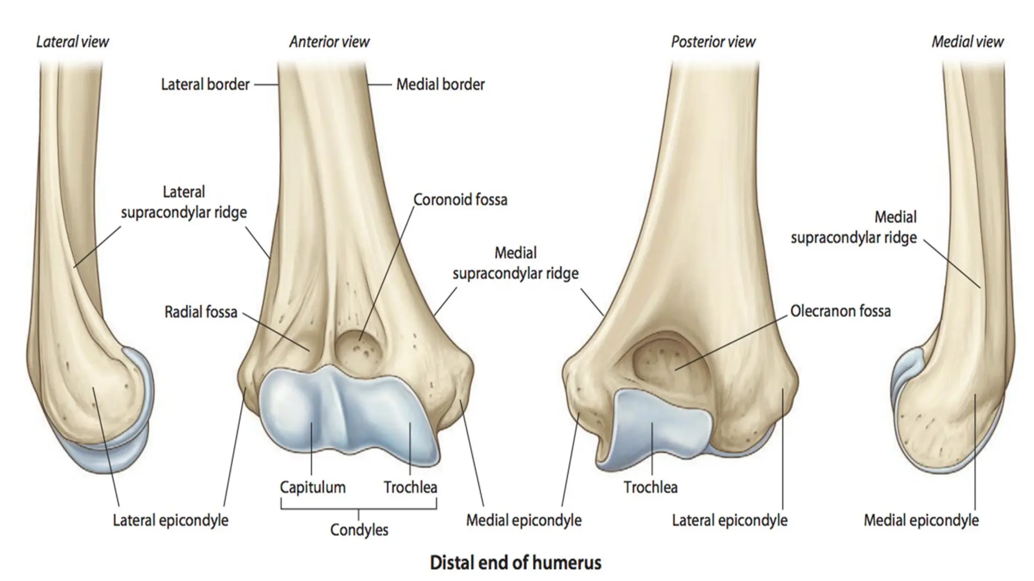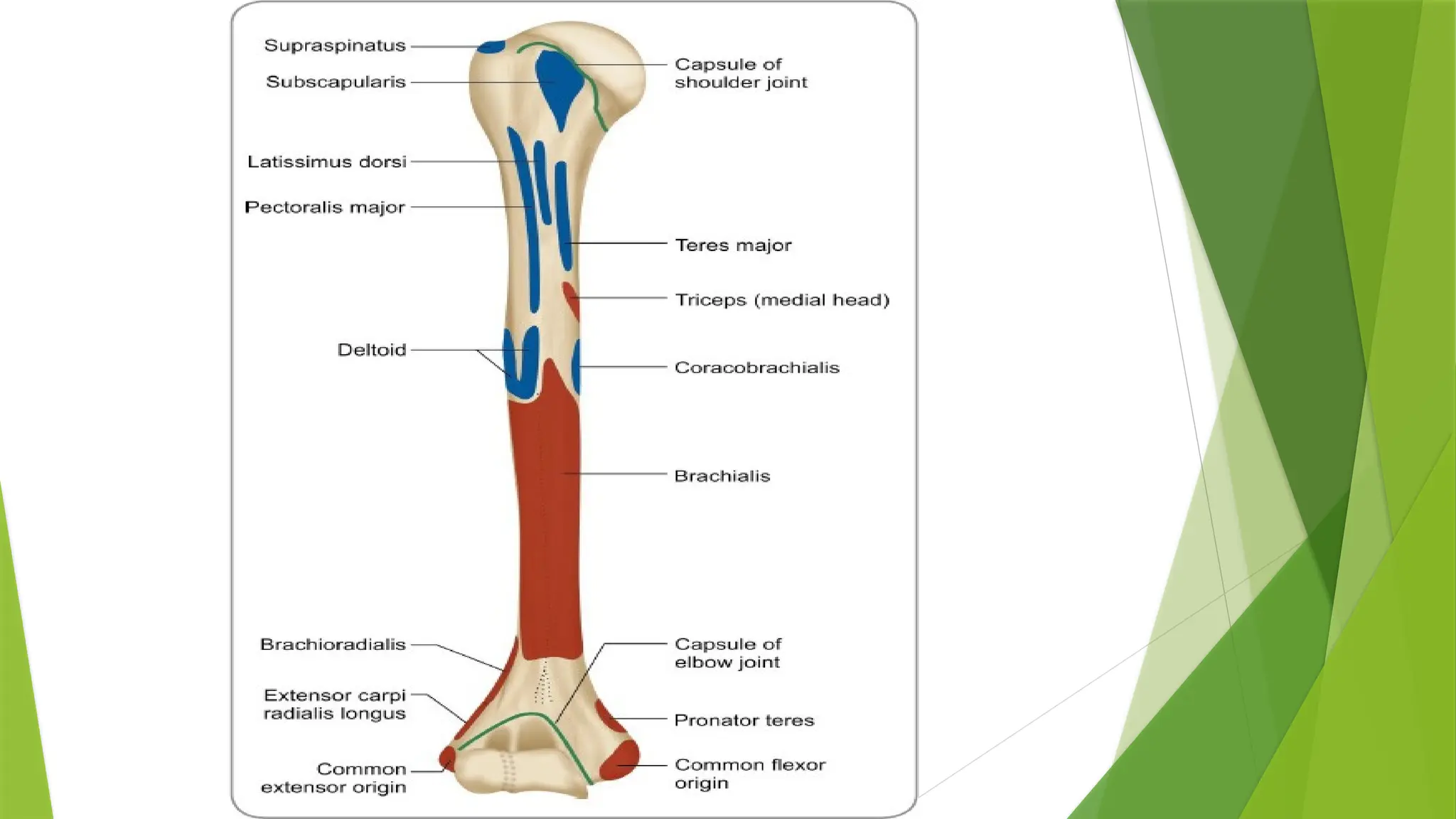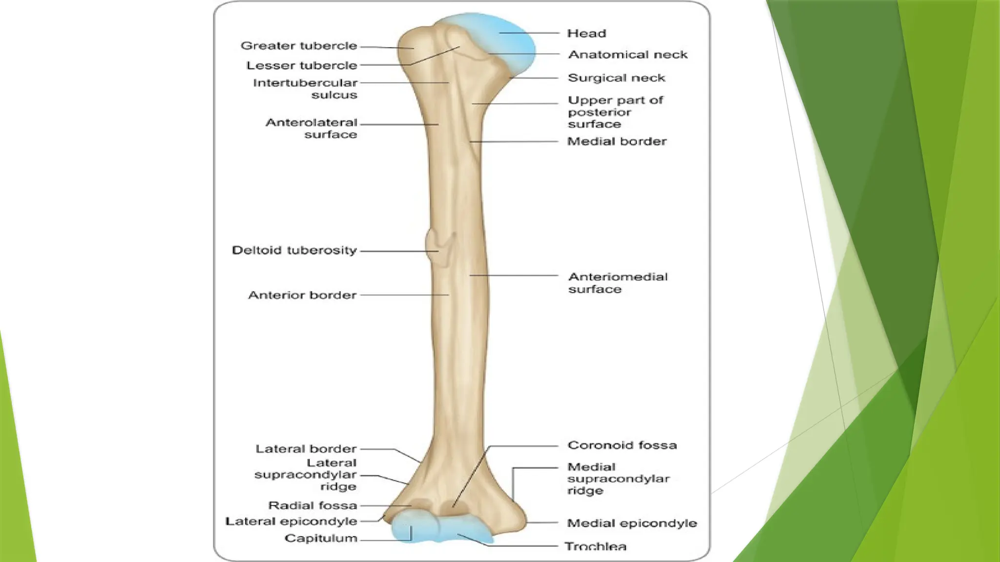 The bodyor shaft of the humerus is triangular to cylindrical in cut