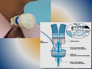 This document discusses humidification in the respiratory tract. It defines various humidity terms and describes how the upper airways normally warm and humidify inspired gases. When intubated, dry medical gases can damage the respiratory tract. Methods to add humidity include heat and moisture exchangers (HMEs), heated humidifiers, and nebulizers. HMEs are efficient but provide moderate humidity. Heated humidifiers can deliver saturated gases but require more maintenance. Nebulizers deliver medication directly but require high gas flows. Proper humidification is important to prevent respiratory complications.