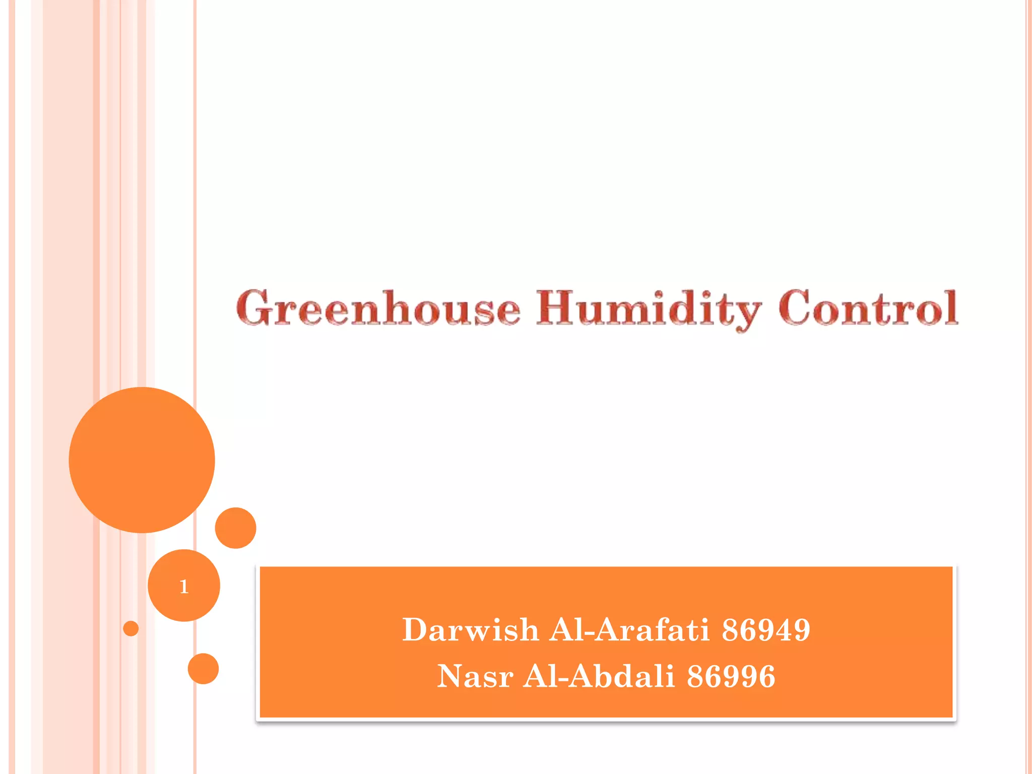 This document describes a humidity control system for greenhouses. It outlines the project objectives of maintaining optimal humidity levels for plant growth. The system design uses a humidity sensor and two comparators with resistors to check voltage across the sensor and trigger actions to control humidity. The total cost is estimated at $7.76. The design is compared to commercial controllers, with advantages of a lower cost but lower resolution and measuring range. Suggestions are provided to improve the design using more accurate components and a microcontroller.
