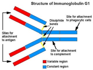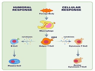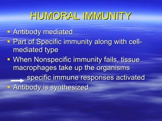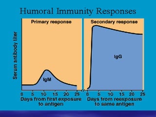 This document discusses humoral immunity and antibodies. It describes how antibodies are produced by B cells and plasma cells in response to antigens. The primary role of antibodies is protection against reinfection by binding to pathogens and marking them for destruction or neutralization. The document provides details on antibody structure, classes, properties, functions, and role in immune responses.