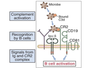 - Engagement of complement receptors and toll-like receptors enhances B cell activation and antibody production. Activated B cells also upregulate costimulators to amplify helper T cell responses.