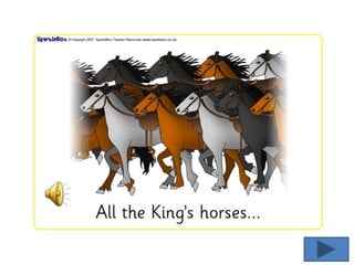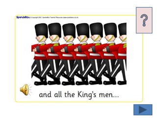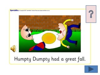 The document discusses the nursery rhyme character Humpty Dumpty by asking what he sat on, what happened to him, who tried to help him, and where he will go now. It also mentions some rotation activities for students such as picture sequencing, guided reading, play, and writing to help them retell the story.