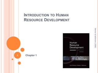 The document provides an introduction to human resource development. It defines HRD as a set of planned activities by an organization to provide members with necessary skills. It traces the evolution of HRD from early apprenticeship and vocational programs to the establishment of training as a profession. Key topics covered include the definition of terms like occupation and job, a description of apprenticeship and guild schools, the impact of the industrial revolution and Model T assembly line on training needs, and the emergence of HRD as a field extending beyond classroom training.