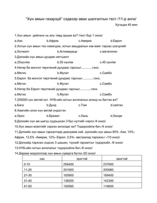 “Хүн амын газарзүй”сэдвээр авах шалгалтын тест /11-р анги/