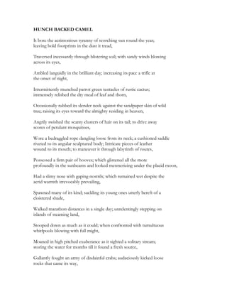 This document describes a hunchbacked camel that lives in the harsh conditions of the Sahara desert. It traverses the blistering soil daily, munching on cactus and rubbing against trees. It carries a saddle and is used to maneuver through labyrinthine routes. Despite the scorching heat, its nose remains wet and it walks marathon distances each day, stooping in whirlwinds and fighting off crabs. It is a stoic and silent warrior that inspires others and has adopted the silver sands as its lifelong companion.