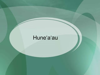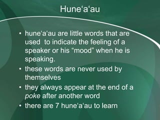 Huneʻaʻau are Hawaiian words that indicate tone or mood when speaking and always appear at the end of phrases. There are 7 huneʻaʻau: nō indicates assurance, hoʻi indicates connection, kā expresses shock or surprise, paha conveys uncertainty, naʻe shows contradiction, lā adds force, and anei forms polite yes-no questions. Huneʻaʻau provide additional meaning about the speaker's intent or feelings.