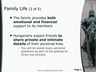 The document discusses various aspects of Hungarian family life, social etiquette, and business etiquette, emphasizing the importance of emotional support and punctuality. It also mentions Hungarian cultural contributions and statistics related to health issues. A PowerPoint presentation is available, covering general information, family life, food, and more.