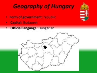 Hungary is a landlocked country located in Central Europe. Its capital and largest city is Budapest. Hungary has a population of around 10 million people and its official language is Hungarian. Some key facts about Hungary include its location along the Danube River basin, its history as a kingdom dating back to 1000 AD, and its economy which relies on agriculture and industry. Hungary is known for its cultural sites, thermal baths, and cuisine including dishes like goulash and dobos torte.