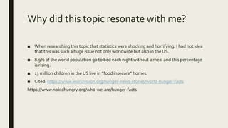 The document discusses eradicating extreme hunger locally and globally. It notes that 8.9% of the world goes to bed hungry each night and over 13 million children in the US live in food insecure homes. Specifically in Washington state, 1 in 7 children and 1 in 10 adults face hunger, with even higher rates in Pierce County. To help address this issue, the document recommends donating to organizations like Feeding America or volunteering at local food banks. It also suggests using social media to raise awareness and encourage more donations and volunteers.