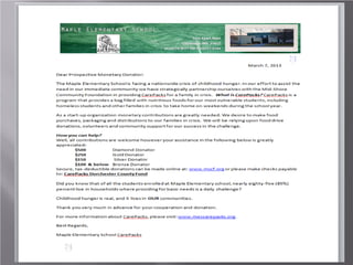 The document discusses the negative effects of poverty on children's health and well-being, including low birth weight and poor nutrition due to inadequate or lack of access to healthy foods. It notes that 62% of households with children under 18 live in poverty in Maryland, and over 200,000 children are at risk of hunger. The CarePacks program aims to address this by providing bags of nutritious, non-perishable foods for vulnerable students to take home on weekends, with the goal of providing meals and snacks to prevent weekend hunger among economically disadvantaged students.