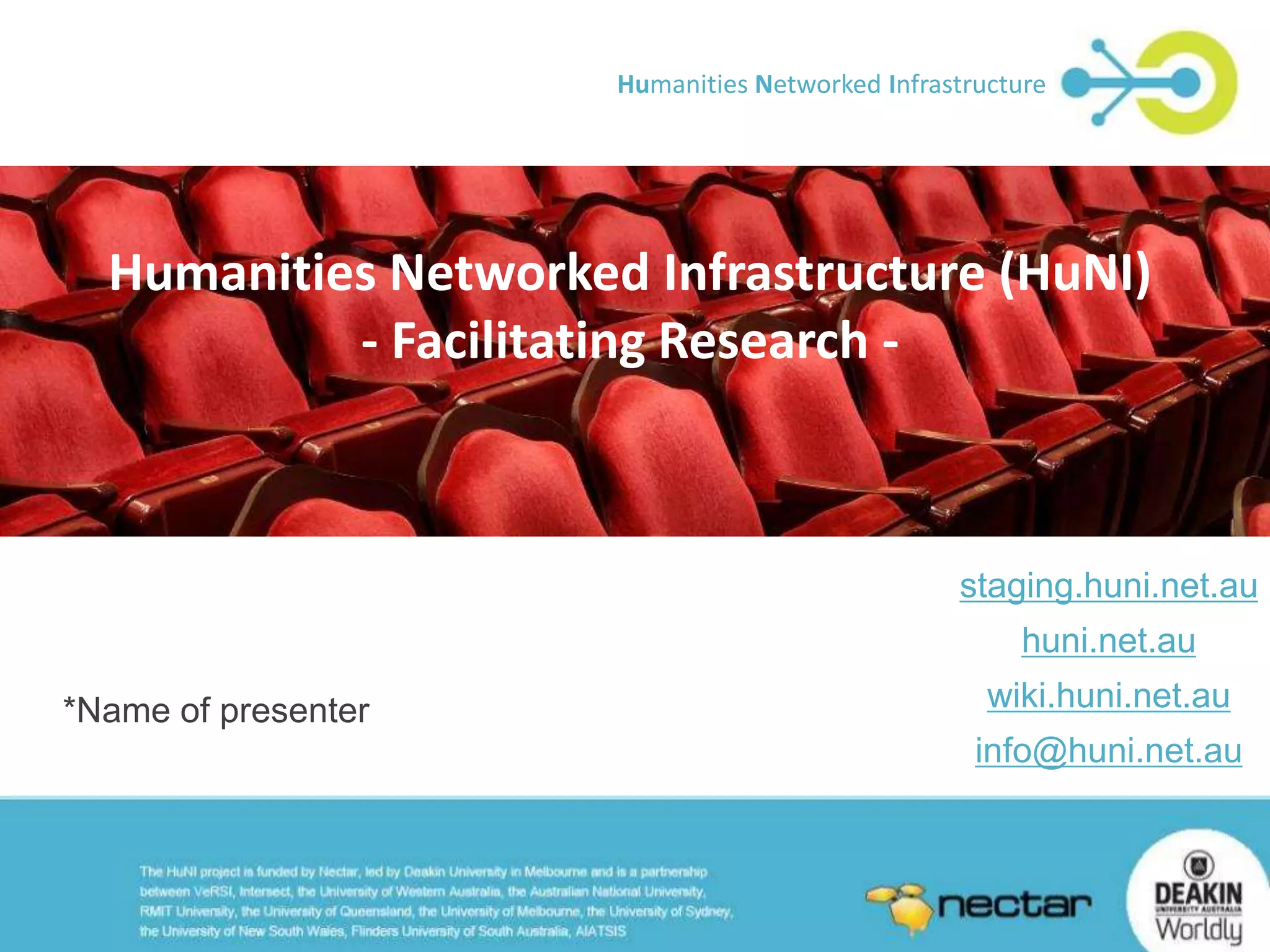 The Humanities Networked Infrastructure (HuNI) combines data from 30 Australian cultural websites into the largest humanities and creative arts database in Australia. It covers all disciplines and brings together information on people, works, events, organizations and places that make up Australia's rich cultural landscape. Researchers can search HuNI, save search results as virtual collections, refine collections by adding links between records, and share collections with other researchers.