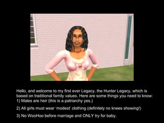 This document introduces the Hunter Legacy family in the Sims 4. The founder, Marcus Hunter, hopes to turn his poor family into a wealthy upper class. His wife Marisa struggles to bond with their twin sons Oscar and Winston. Their eldest daughter Evelyn worries about her appearance but blossoms into a beautiful young woman, though her mother Marisa seems to be manipulating her relationships for financial gain.