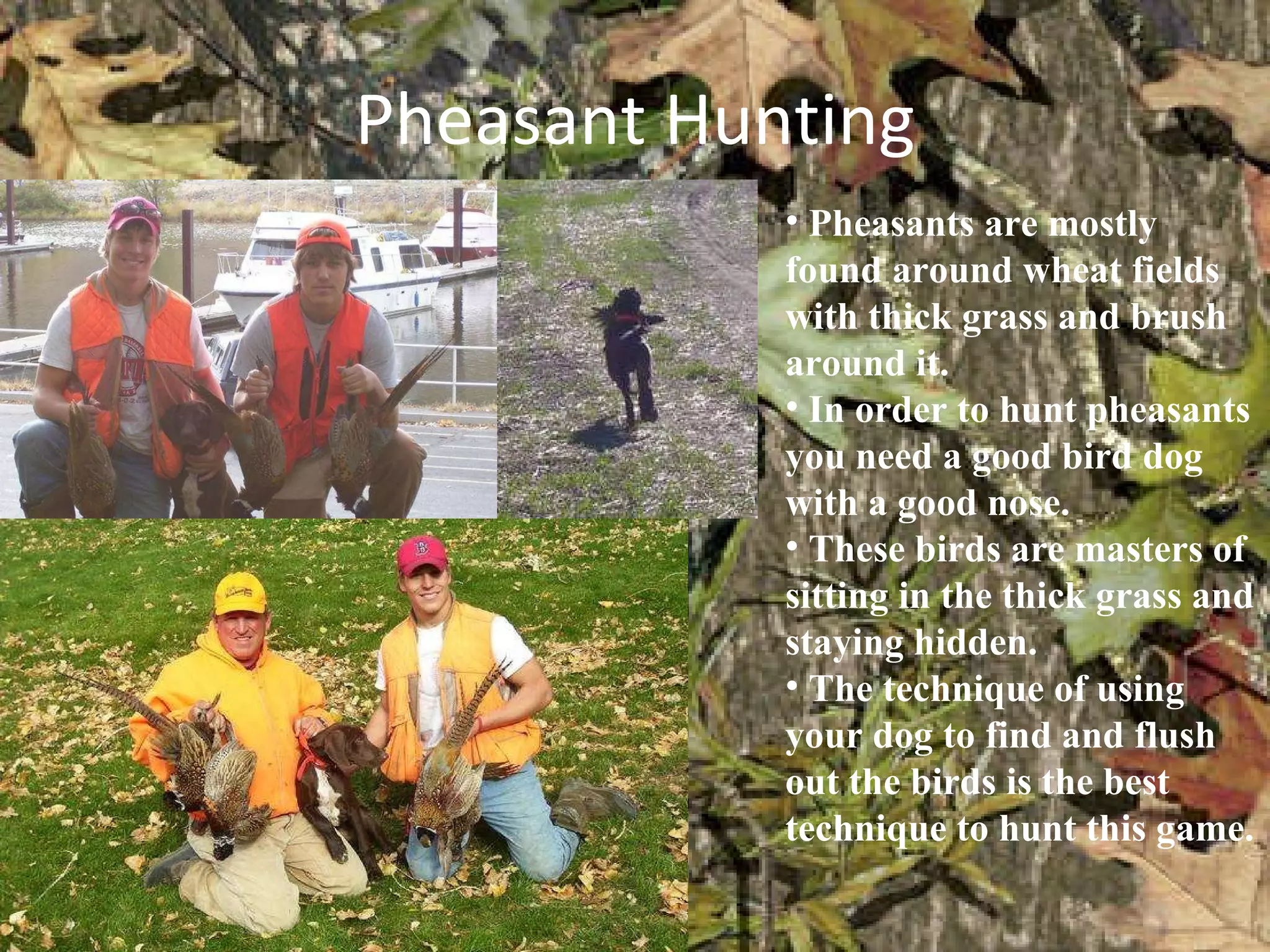 The document discusses various types of hunting, including pheasant hunting which involves using bird dogs to flush hidden pheasants from wheat fields with thick grass and brush. It also mentions bow hunting of animals like deer, elk and moose using compound or recurve bows. The document lists whitetail deer, mule deer and blacktail deer as types found in the Northwest and names some of the author's favorite things to hunt like cougars, carp and turkeys.