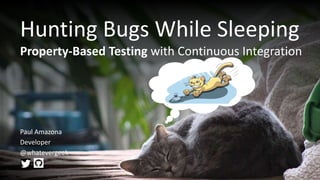 This document discusses property-based testing with continuous integration to hunt bugs. It explains property-based testing, which asserts properties about the relationship between inputs and outputs rather than just example tests. The document covers using predetermined and randomized inputs with libraries like Hypothesis. It also demonstrates a continuous integration pipeline for bug hunting that runs property tests with randomized inputs on a scheduled basis to thoroughly test code. The goal is to detect bugs earlier by randomly testing properties rather than just examples.