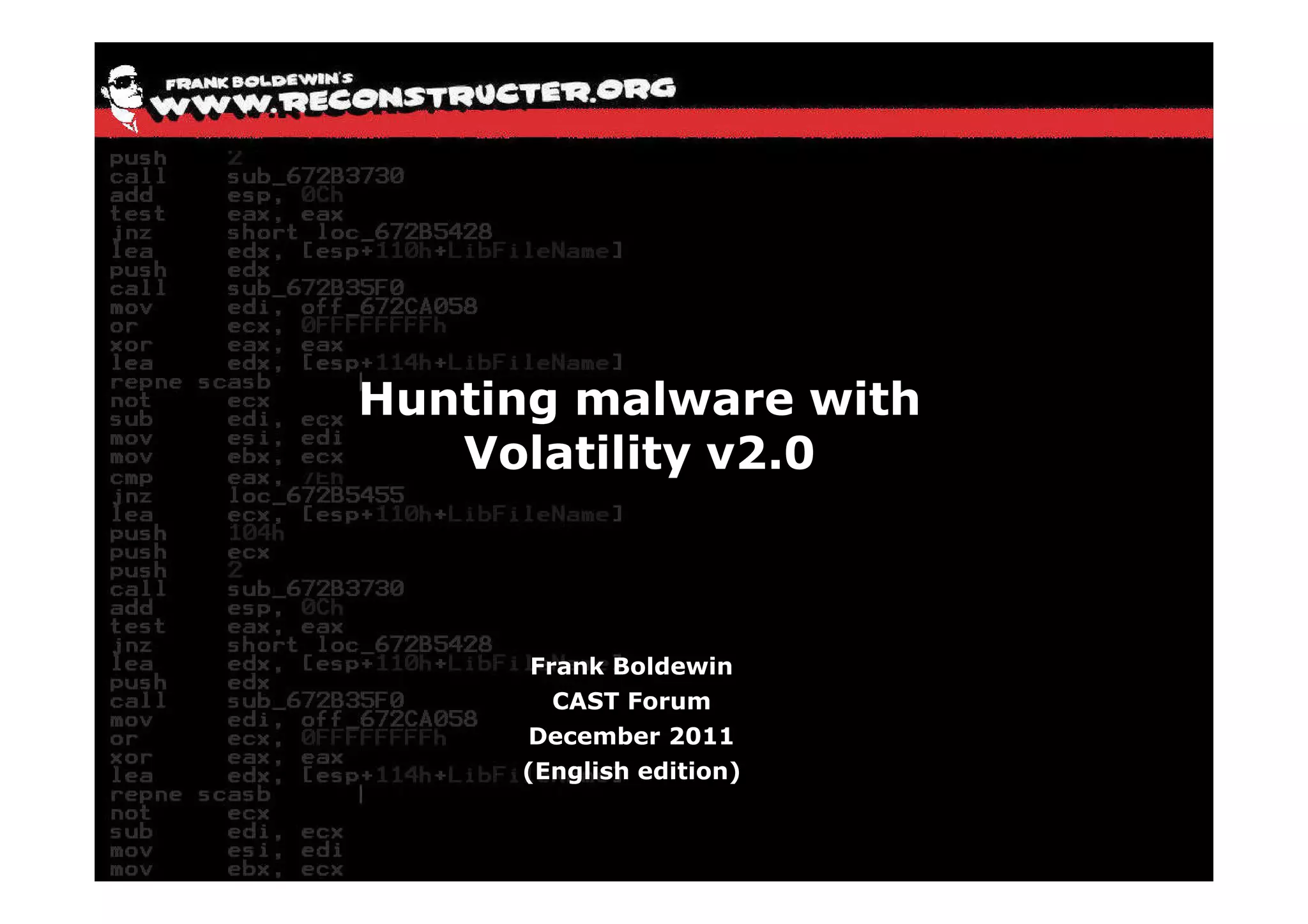 The document discusses Volatility v2.0, a Python-based forensics framework for analyzing memory dumps to detect malware. It explains the advanced scanning techniques used in Volatility to identify malicious activity through various kernel structures and plugins, such as malfind and yara for code injection detection. The conclusion emphasizes the importance of a skilled analyst in effectively using Volatility to discern genuine threats from potential false positives.