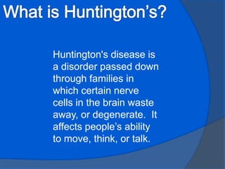 Huntington's disease is a genetic disorder that causes certain nerve cells in the brain to break down over time. It is inherited in an autosomal dominant pattern, meaning only one parent needs to carry the gene for a child to be at risk. Common symptoms include behavioral changes, abnormal movements, dementia, and difficulty swallowing and speaking. While there is no cure, lifestyle interventions including diet, supplements, exercise and social support can help manage symptoms and potentially delay onset. The disease is caused by destruction of cells in the basal ganglia and approximately 1 in 33,333 people in the US are affected.