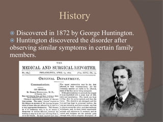 Huntington's disease is a hereditary, progressive brain disorder causing physical, mental, and emotional changes, primarily affecting the basal ganglia and cortex. Diagnosis involves genetic testing and clinical evaluation, while symptoms include cognitive decline, mood changes, and involuntary movements, typically starting between ages 30-50. There is currently no cure, and treatment focuses on managing symptoms and improving quality of life through a multi-disciplinary approach.