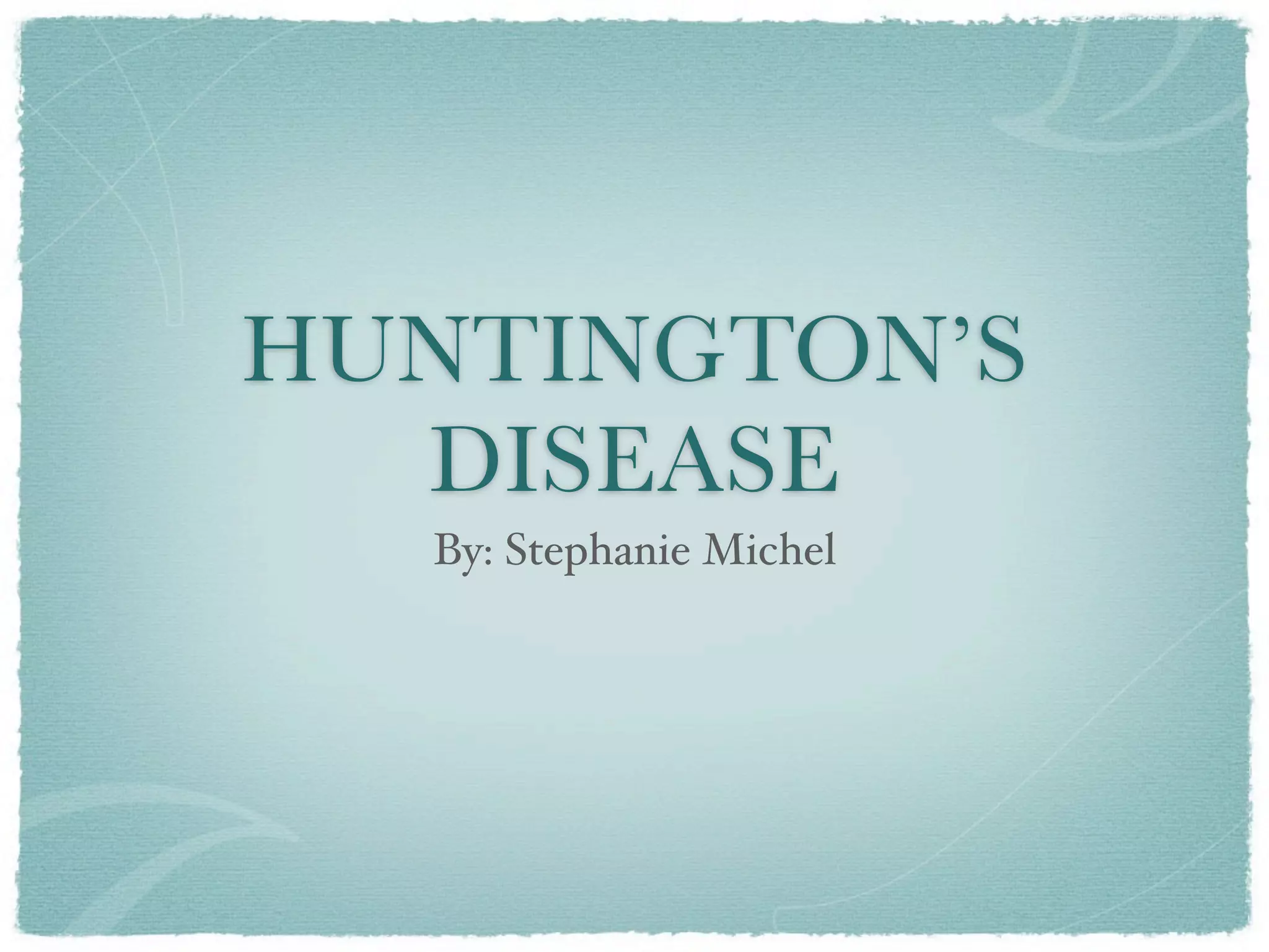 Huntington's disease is a genetic disorder that causes brain cells to waste away over time. It is passed down through families and results from a defective gene on chromosome 4 that causes an excess of the protein CAG. The disease has two types - adult onset which occurs in one's 30s-40s and is more common, and childhood onset which happens at a young age in rare cases. Signs and symptoms include involuntary movements, cognitive and psychiatric problems, and eventually death around 15-20 years after diagnosis usually from infection or sometimes suicide.