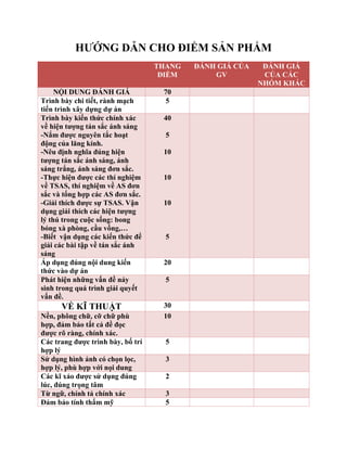 Tài liệu cung cấp hướng dẫn chi tiết cho việc đánh giá điểm sản phẩm theo thang điểm cho các nhóm, với tổng điểm tối đa là 100. Các tiêu chí đánh giá bao gồm việc trình bày kiến thức về hiện tượng tán sắc ánh sáng, thực hiện thí nghiệm, và sử dụng các kỹ thuật trình bày phù hợp. Các mức xếp loại được phân chia từ tốt đến kém dựa trên điểm số đạt được.