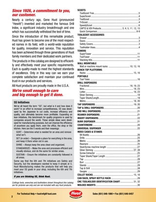 This document provides information on various industrial cutting tool storage and transport products from Huot Manufacturing, including ToolScoots, SuperScoots, wall mounts, dispensers, and accessories. It describes the products' features and benefits for efficiently storing and organizing cutting tools. Product numbers and short descriptions are provided throughout for identifying and ordering the different storage solutions.
