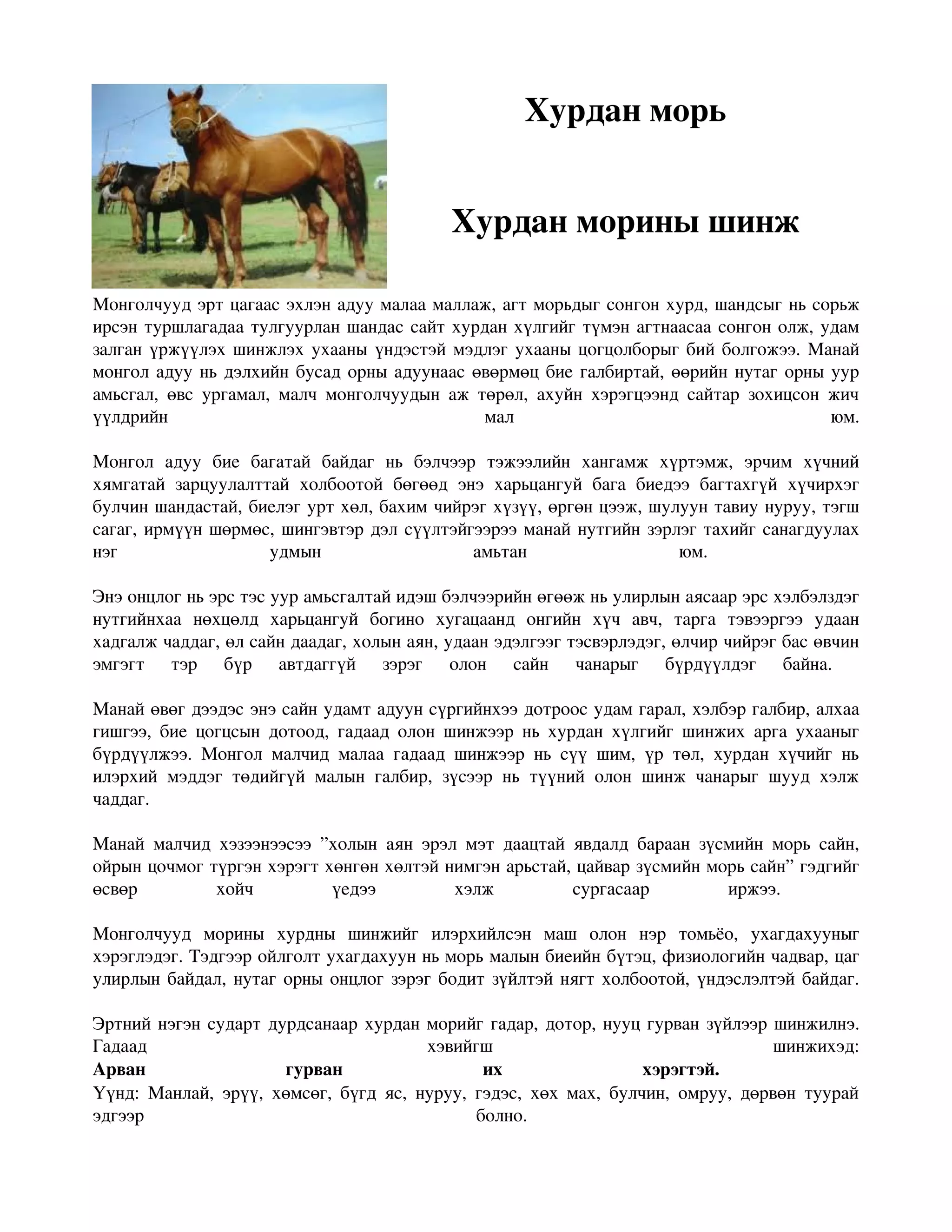 Хурдан морины шинж Монголчууд эрт цагаас эхлэн адуу малаа маллаж, агт морьдыг сонгон хурд, шандсыг нь сорьж ирсэн туршлагадаа тулгуурлан шандас сайт хурдан хүлгийг түмэн агтнаасаа сонгон олж, удам залган үржүүлэх шинжлэх ухааны үндэстэй мэдлэг ухааны цогцолборыг бий болгожээ. Манай монгол адуу нь дэлхийн бусад орны адуунаас өвөрмөц бие галбиртай, өөрийн нутаг орны уур амьсгал, өвс ургамал, малч монголчуудын аж төрөл, ахуйн хэрэгцээнд сайтар зохицсон жич үүлдрийн мал юм. Монгол адуу бие багатай байдаг нь бэлчээр тэжээлийн хангамж хүртэмж, эрчим хүчний хямгатай зарцуулалттай холбоотой бөгөөд энэ харьцангуй бага биедээ багтахгүй хүчирхэг булчин шандастай, биелэг урт хөл, бахим чийрэг хүзүү, өргөн цээж, шулуун тавиу нуруу, тэгш сагаг, ирмүүн шөрмөс, шингэвтэр дэл сүүлтэйгээрээ манай нутгийн зэрлэг тахийг санагдуулах нэг удмын амьтан юм. Энэ онцлог нь эрс тэс уур амьсгалтай идэш бэлчээрийн өгөөж нь улирлын аясаар эрс хэлбэлздэг нутгийнхаа нөхцөлд харьцангуй богино хугацаанд онгийн хүч авч, тарга тэвээргээ удаан хадгалж чаддаг, өл сайн даадаг, холын аян, удаан эдэлгээг тэсвэрлэдэг, өлчир чийрэг бас өвчин эмгэгт тэр бүр автдаггүй зэрэг олон сайн чанарыг бүрдүүлдэг байна. Манай өвөг дээдэс энэ сайн удамт адуун сүргийнхээ дотроос удам гарал, хэлбэр галбир, алхаа гишгээ, бие цогцсын дотоод, гадаад олон шинжээр нь хурдан хүлгийг шинжих арга ухааныг бүрдүүлжээ. Монгол малчид малаа гадаад шинжээр нь сүү шим, үр төл, хурдан хүчийг нь илэрхий мэддэг төдийгүй малын галбир, зүсээр нь түүний олон шинж чанарыг шууд хэлж чаддаг. Манай малчид хэзээнээсээ ”холын аян эрэл мэт даацтай явдалд бараан зүсмийн морь сайн, ойрын цочмог түргэн хэрэгт хөнгөн хөлтэй нимгэн арьстай, цайвар зүсмийн морь сайн” гэдгийг өсвөр хойч үедээ хэлж сургасаар иржээ. Монголчууд морины хурдны шинжийг илэрхийлсэн маш олон нэр томьёо, ухагдахууныг хэрэглэдэг. Тэдгээр ойлголт ухагдахуун нь морь малын биеийн бүтэц, физиологийн чадвар, цаг улирлын байдал, нутаг орны онцлог зэрэг бодит зүйлтэй нягт холбоотой, үндэслэлтэй байдаг. Эртний нэгэн сударт дурдсанаар хурдан морийг гадар, дотор, нууц гурван зүйлээр шинжилнэ. Гадаад хэвийгш шинжихэд: Арван гурван их хэрэгтэй. Үүнд: Манлай, эрүү, хөмсөг, бүгд яс, нуруу, гэдэс, хөх мах, булчин, омруу, дөрвөн туурай эдгээр болно.