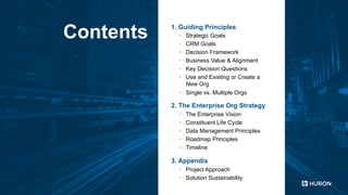 The document outlines a strategic roadmap for utilizing Salesforce as an enterprise-wide CRM, focusing on creating scalable engagement models, enhancing visibility, and consolidating data management across various business units. It discusses the decision framework for structuring Salesforce orgs, emphasizing the trade-offs between integration, organizational independence, and system maintenance costs. Additionally, the importance of change management, training, and governance is highlighted to ensure seamless implementation and adoption of new systems within the organization.