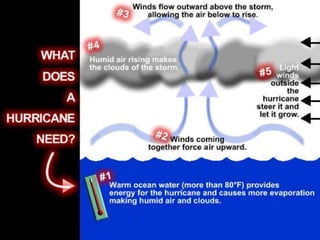 Hurricanes are large tropical storms that form over warm ocean waters. They develop from tropical disturbances and become stronger as they draw heat from the warm ocean air. Hurricanes have sustained wind speeds over 74 mph and can unleash massive amounts of rain. They contain an eye at the center surrounded by the strongest winds and rains. When making landfall, hurricanes cause devastating storm surges, high winds, floods and tornadoes that result in the majority of hurricane deaths. Accurate forecasts are needed to warn people to evacuate from these dangerous storms.