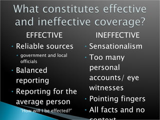 The document analyzes news coverage before, during, and after Hurricane Katrina across multiple news sources. It finds that coverage before the storm in the New York Times and USA Today was most effective, providing balanced reporting, context, and addressing the risks and need for flood prevention. During the storm, the Times-Picayune and USA Today flight tracker provided the most detailed and factual coverage through photos and updates. After the storm, USA Today and BBC articles best analyzed economic and environmental impacts by providing context and balancing expert opinions with facts.