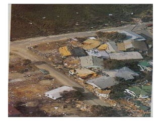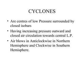 Hurricanes and cyclones are low pressure weather systems surrounded by closed isobars with increasing pressure outward and circulating air towards the center. There are two main types: tropical cyclones that form between the Tropics of Cancer and Capricorn, and extra-tropical cyclones that form at higher latitudes. Tropical cyclones are classified based on intensity from weak to strong, with hurricanes being the strongest type in this region. Hurricanes have very low central pressures below 950 mb and can have wind speeds over 180 kph. They also have an eye of low wind at the center that is typically rain-free.